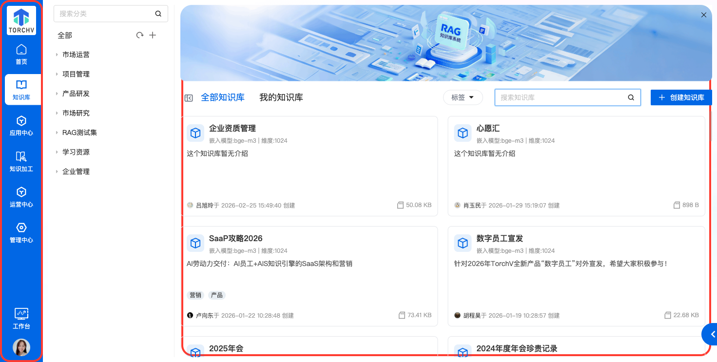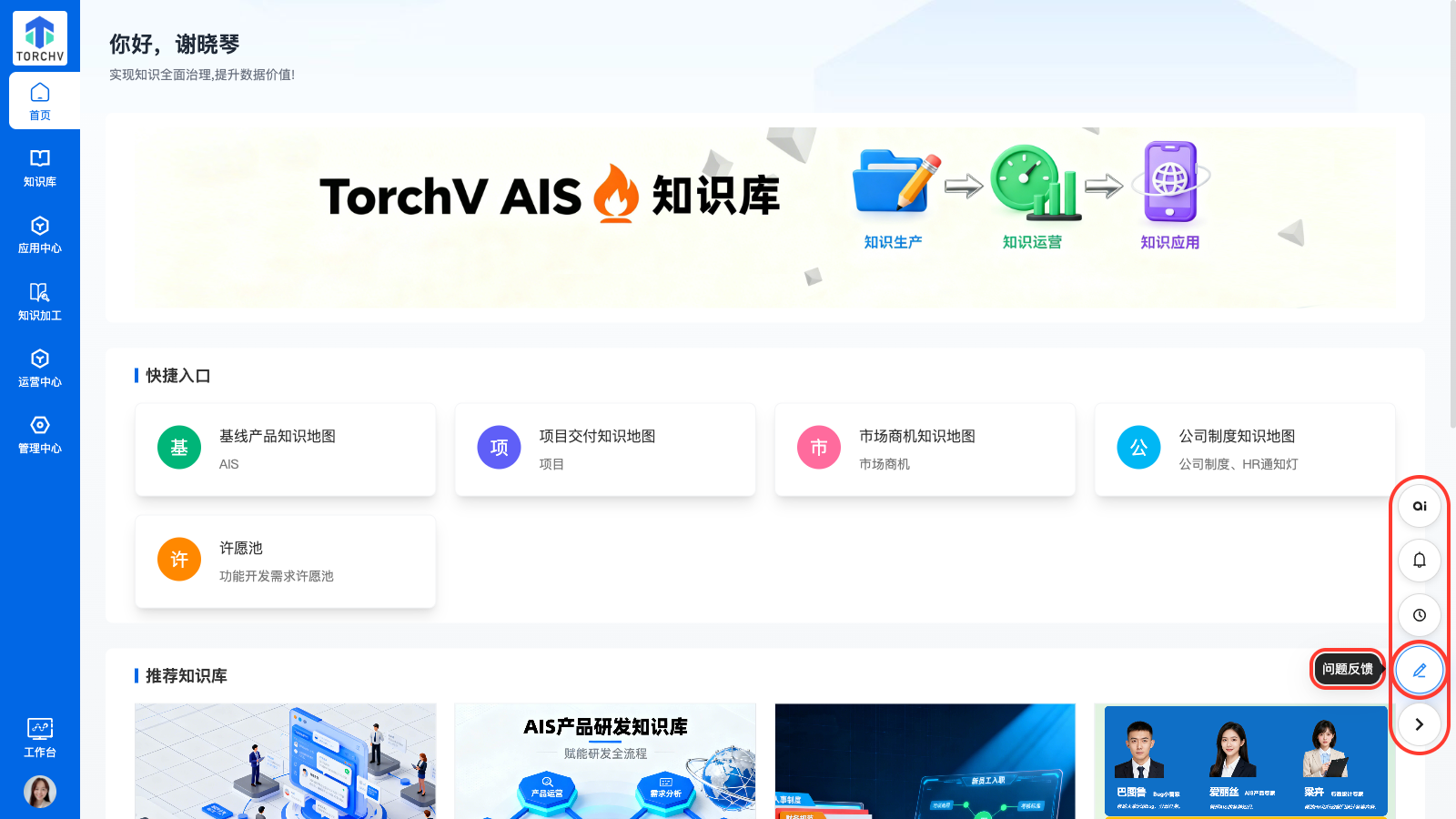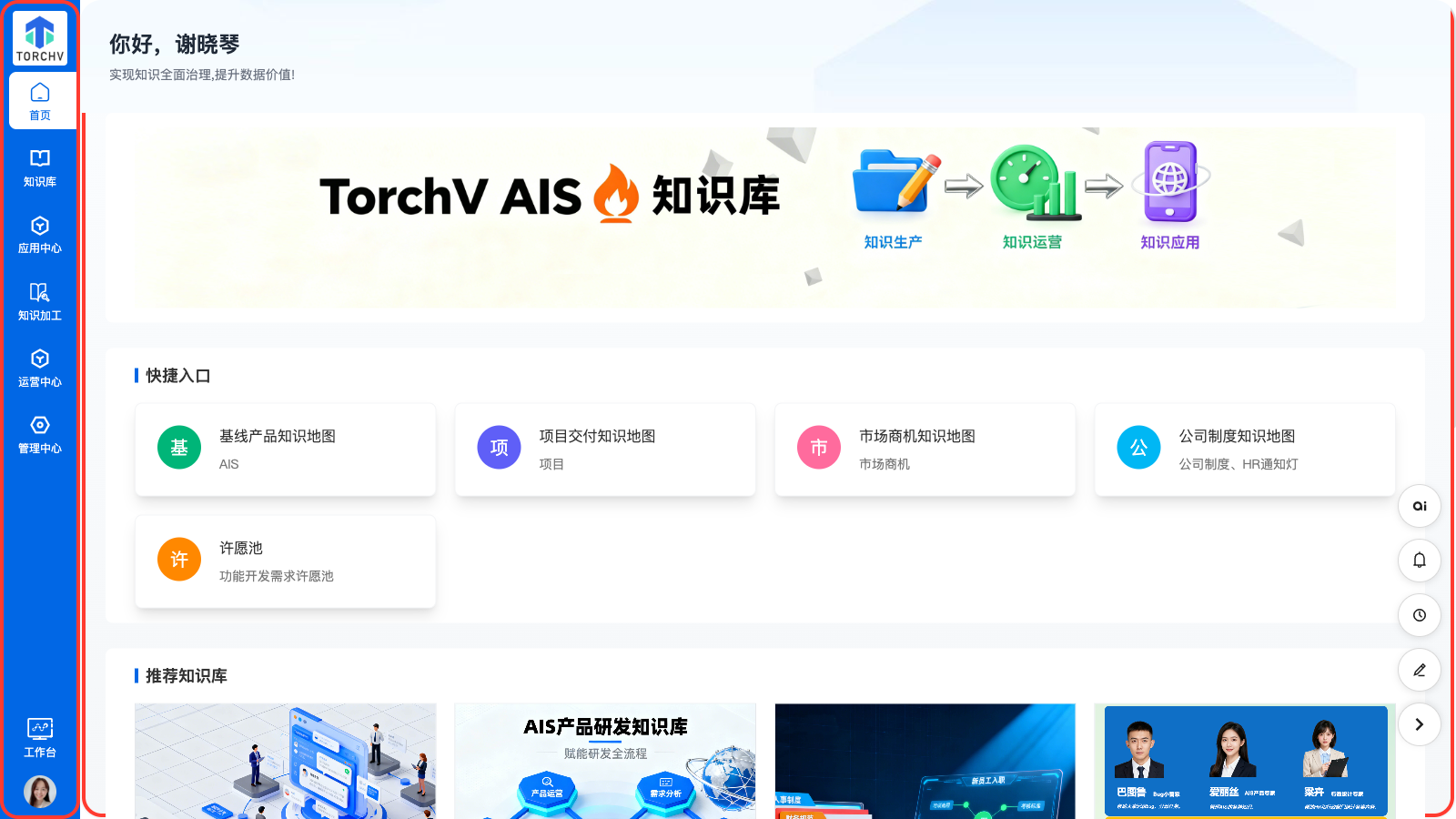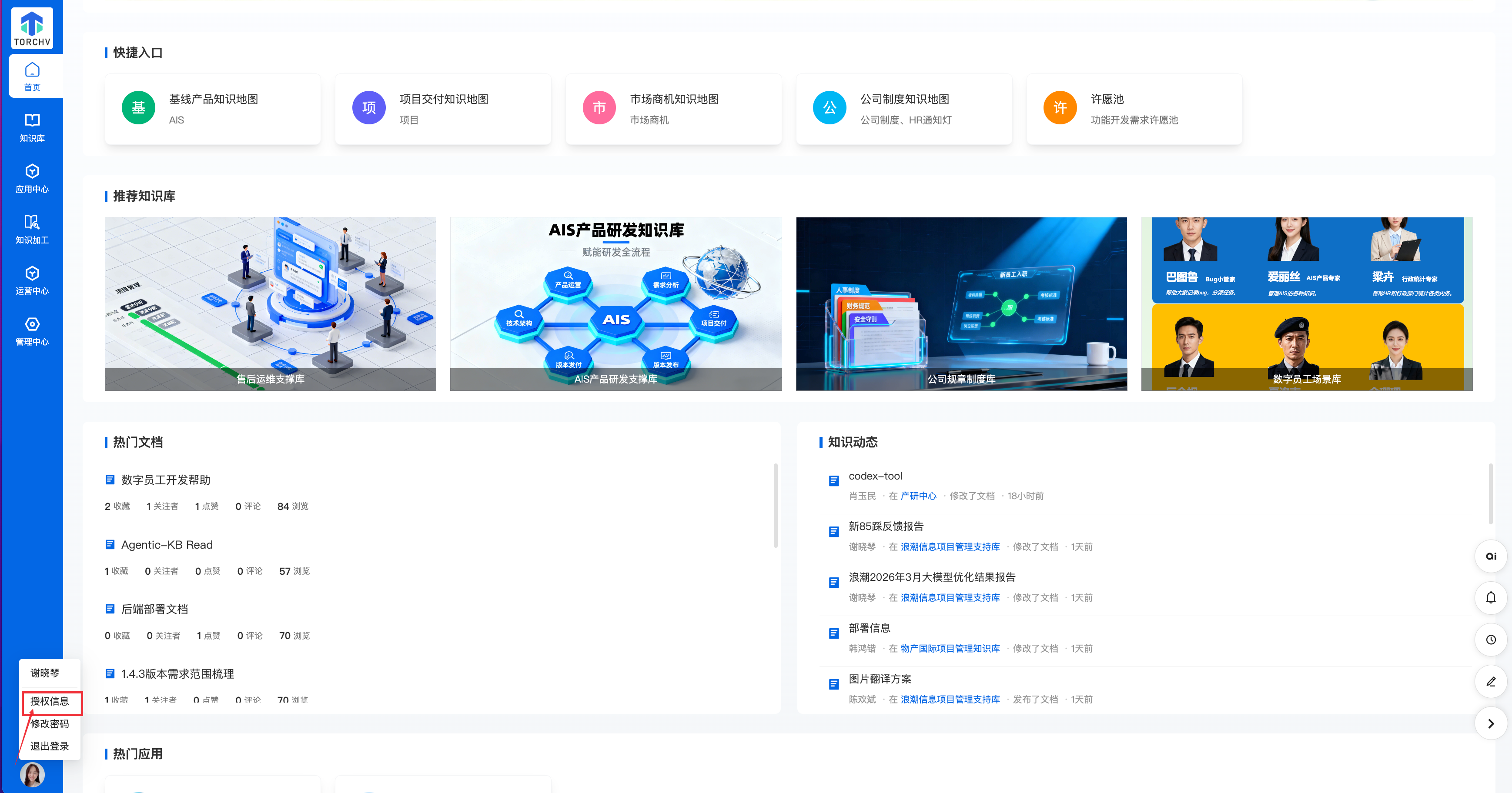 - 功能特点:首页聚合了常用入口与动态信息,适合作为日常使用的总览页;卡片类入口点击后会直接跳转到对应知识库或应用。