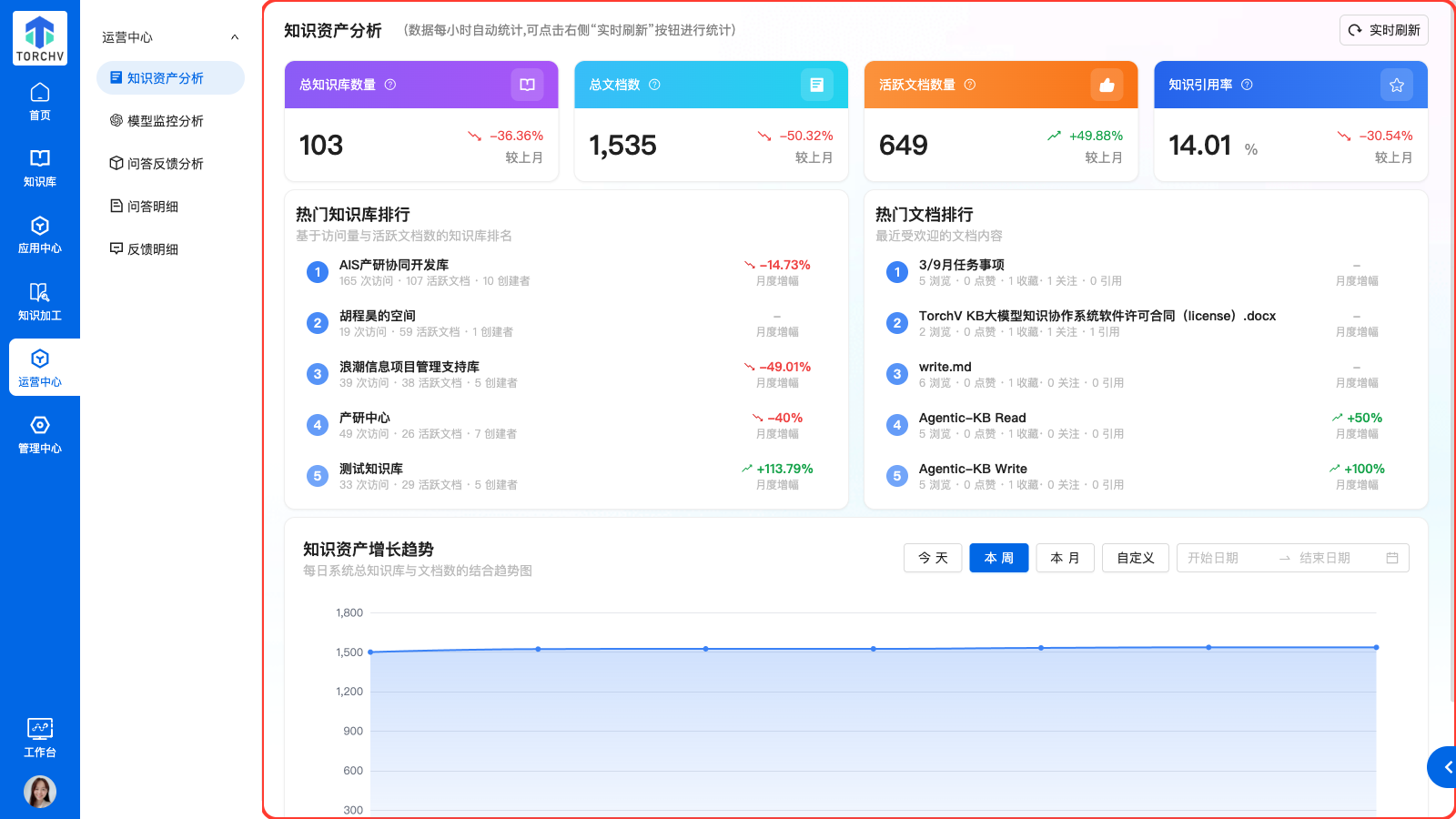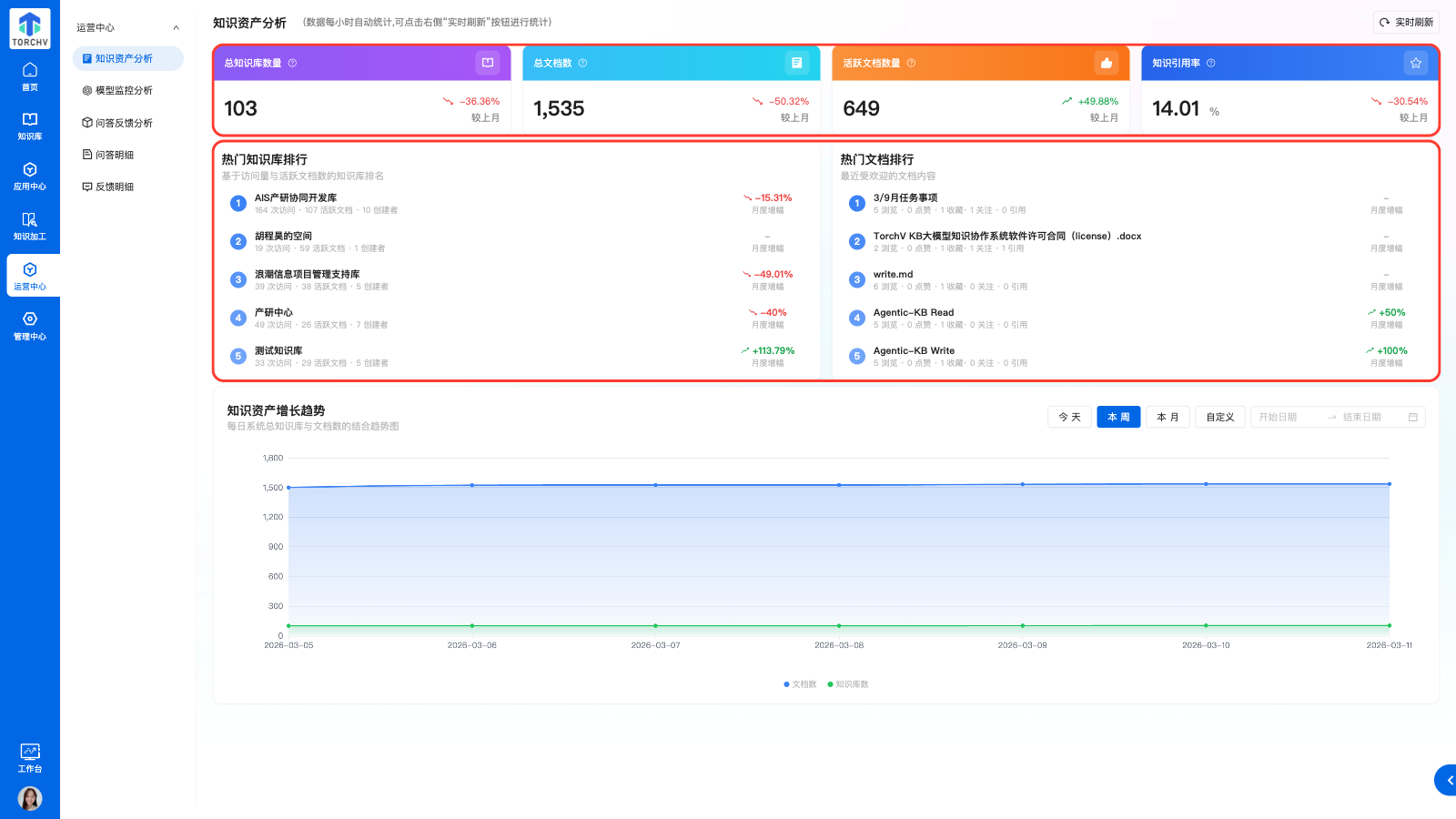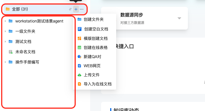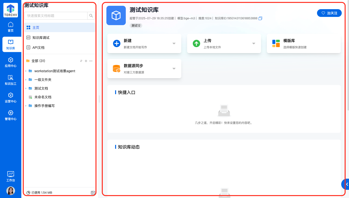 - 功能特点:首页聚合了常用入口与动态信息,适合作为日常使用的总览页;卡片类入口点击后会直接跳转到对应知识库或应用。