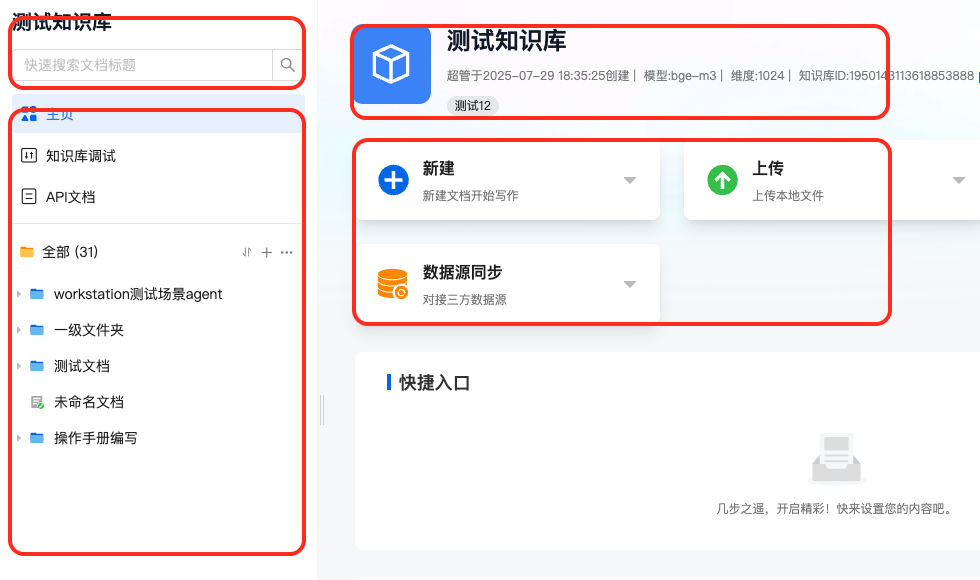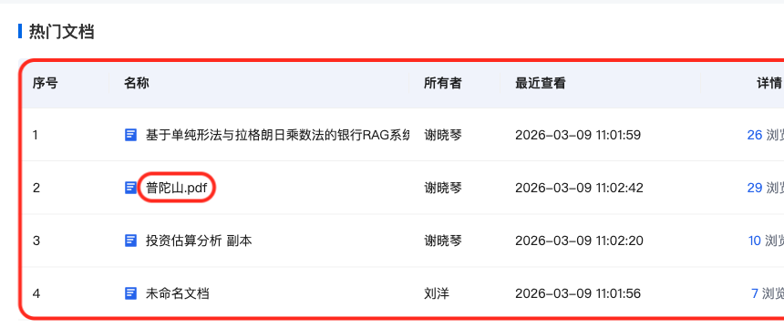 - 功能说明:查看首页中的快捷入口、推荐知识库、热门文档、知识动态和热门应用等核心内容。