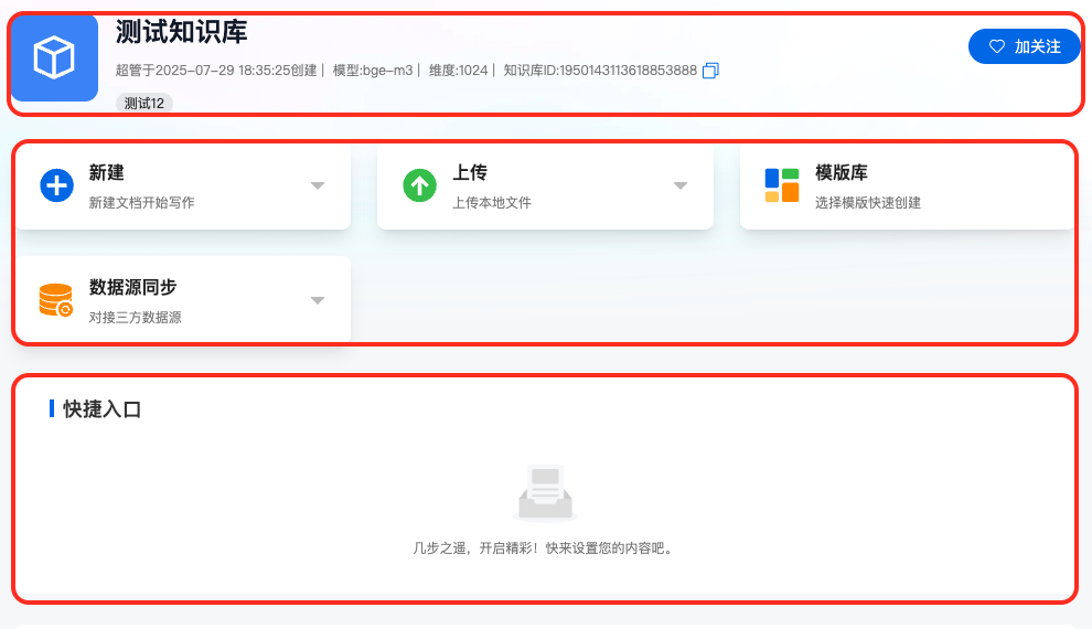 - 查看页面中的快捷入口、推荐知识库、热门文档、知识动态和热门应用模块。