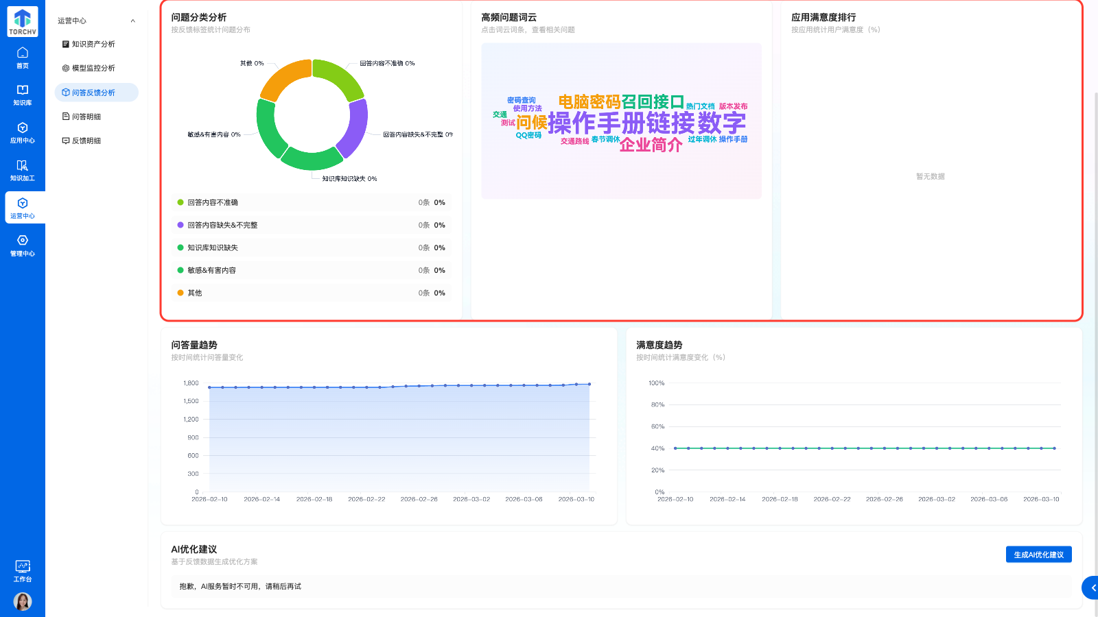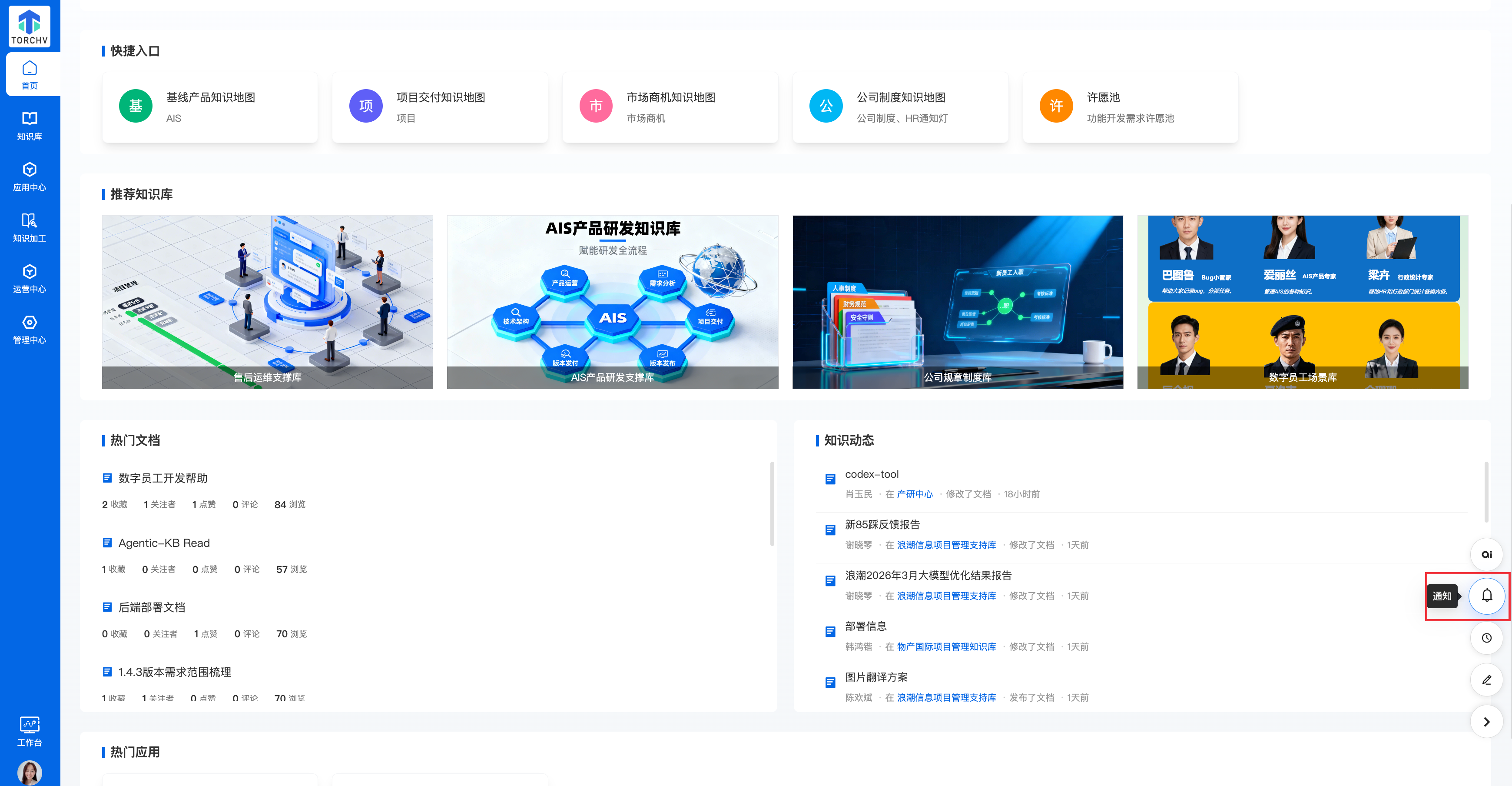 该页面主要承载的业务包括:集中展示常用知识地图、推荐知识库和热门应用入口;帮助用户快速查看近期热门文档和知识动态;提供 AI 对话、通知、版本记录、问题反馈等快捷操作入口。