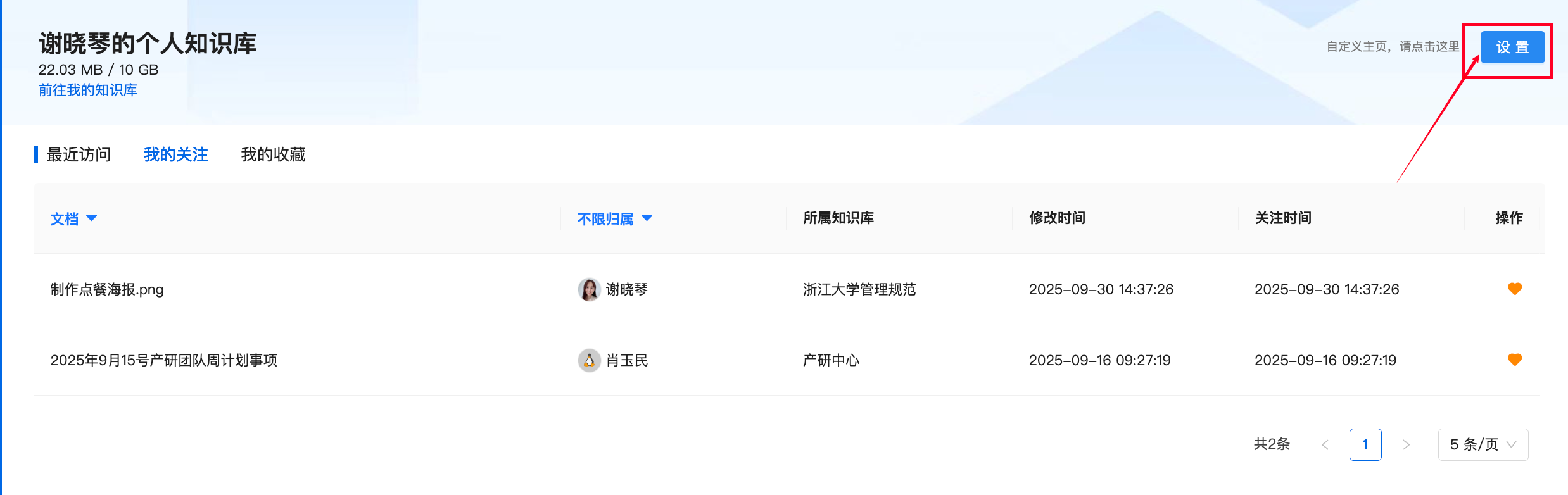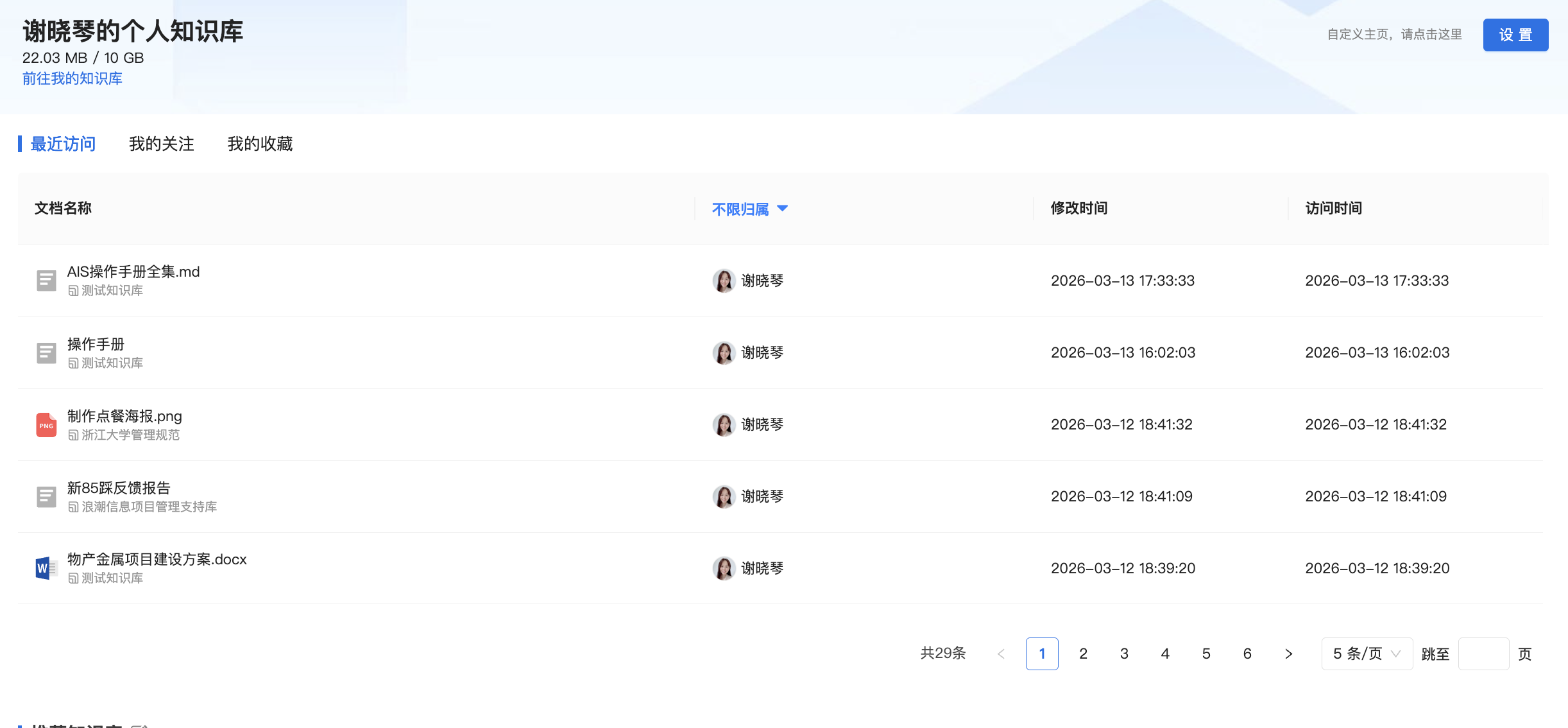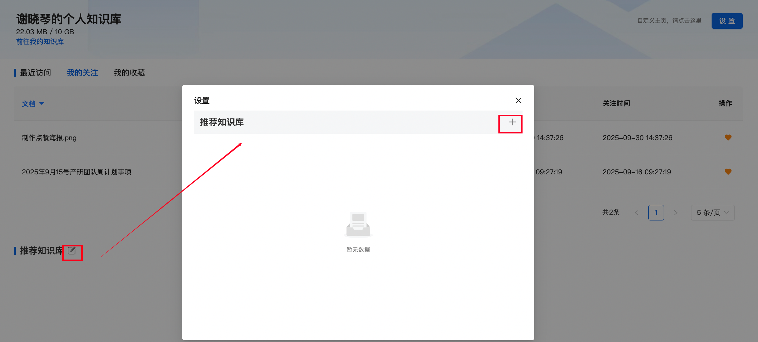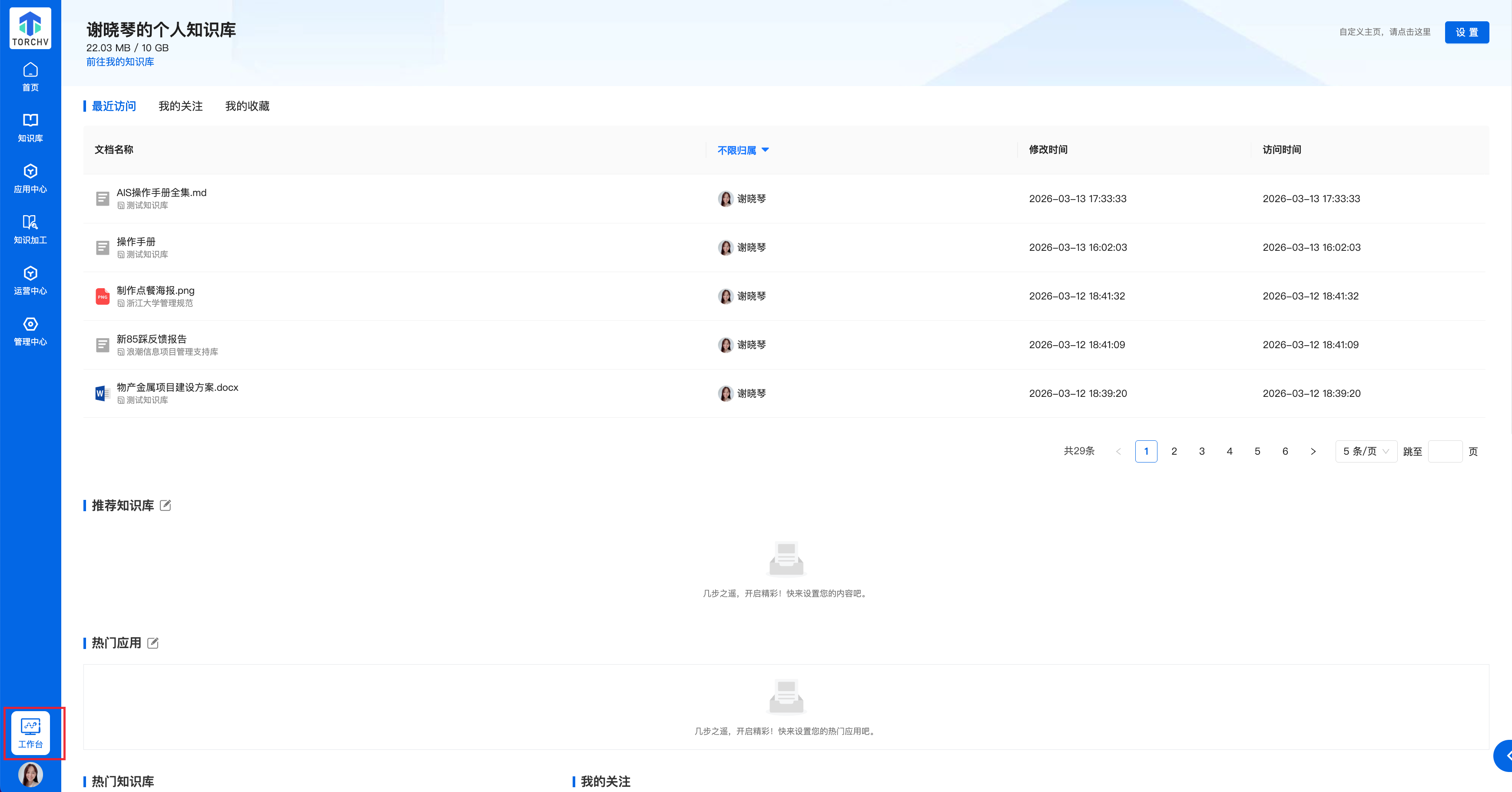 - 功能说明:查看工作台首页中的主要内容分区、个人知识库信息和页面设置入口。
